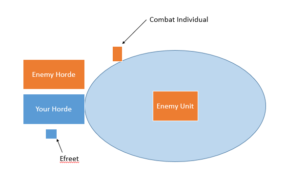 The light blue circle represents the 12” bubble around the right hand enemy unit that I would need to move my Efreet within in order to shoot at that right hand enemy unit. At the moment by Efreet is safely tucked behind my (blue) horde, protecting it from being charged. My opponent obviously doesn’t want me to shoot at their unit on my right flank. They’ve moved a combat individual up so that if I try and move within that 12” bubble, they will be able to charge my Efreet.
