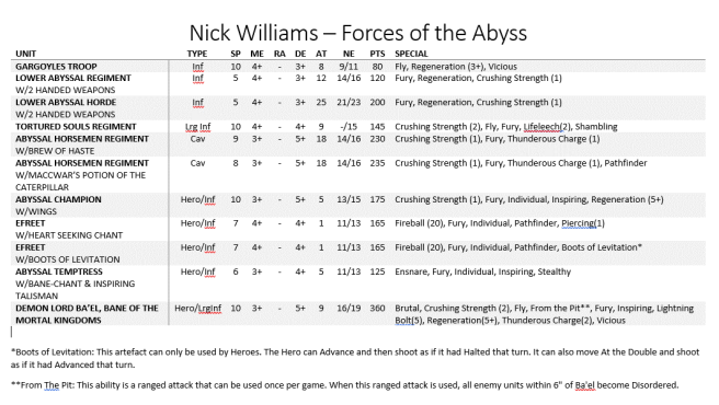 The army splits into two to three battlegroups, depending on what’s in my opponents army. My infantry battlegroup consists of the Lower Abyssals, Abyssal Temptress and the two Efreet. The Abyssal Champion often operates on his own, while everything else goes in my fast attack wing.