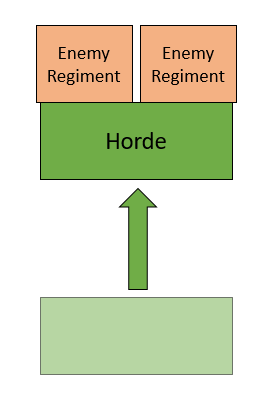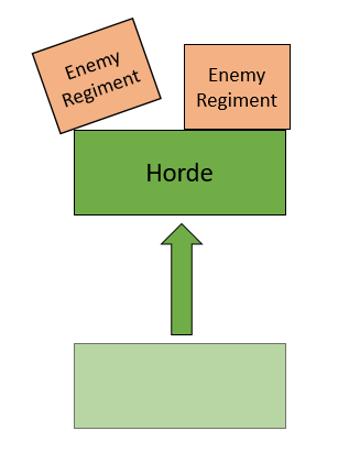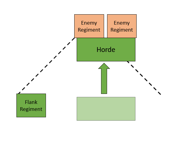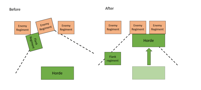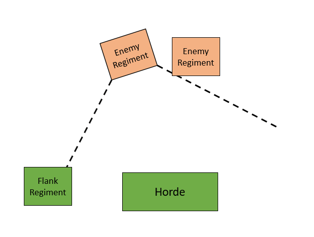 In order for the horde to do its split charge, it’s going to have to charge first. If the flank regiment moves first, then once it aligns, the enemy regiment can’t then align to the horde. So the horde has to charge first, and the enemy regiment aligns to it as before: