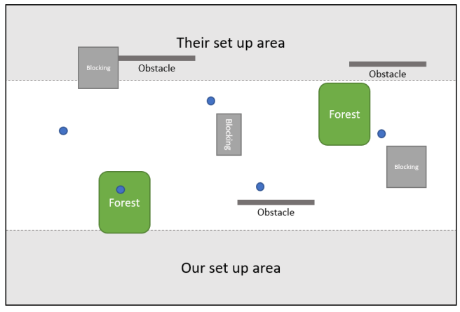 We set up our units on the left flank, with my Werewolves on the very left and Spuds units spread out from the forest to the middle of the table. The Shocktroops horde deployed between the left hand blocking terrain and the board edge, with the Warlock, Death Engine and Weapons Team behind and a screening unit of Vermintide in front. The Spitters set up behind the obstacle to the right, then the chariot regiment to the right of them and a vermintide unit opposite the far right objective.