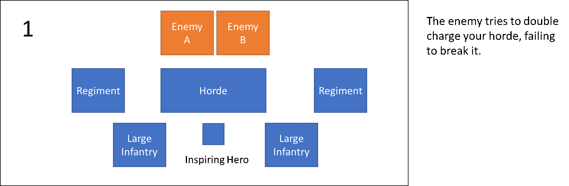 The remaining large infantry unit in this example is waiting in support in case the front horde breaks in the next turn. It can then rush into the gap and the enemy is still facing down 50 shades of hurt from the large infantry.