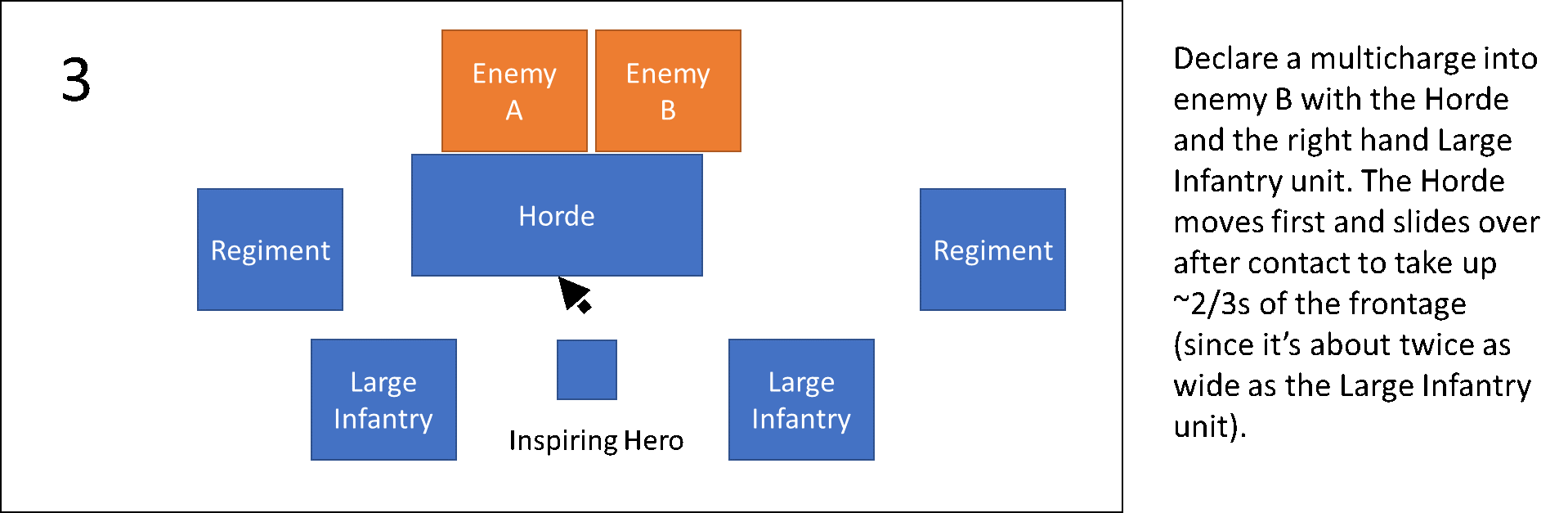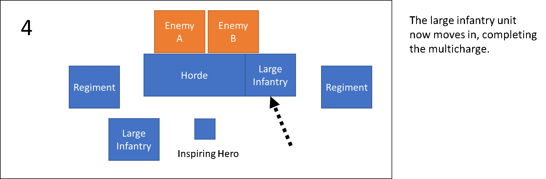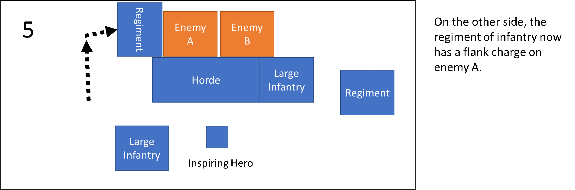 The remaining infantry regiment is now free to either position itself to protect the flanks of the large infantry, wind up for a charge against another target or even go after an objective in relative safety.