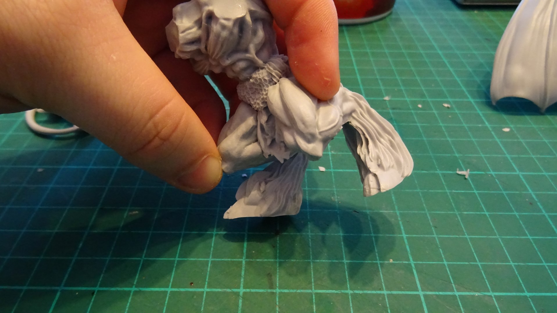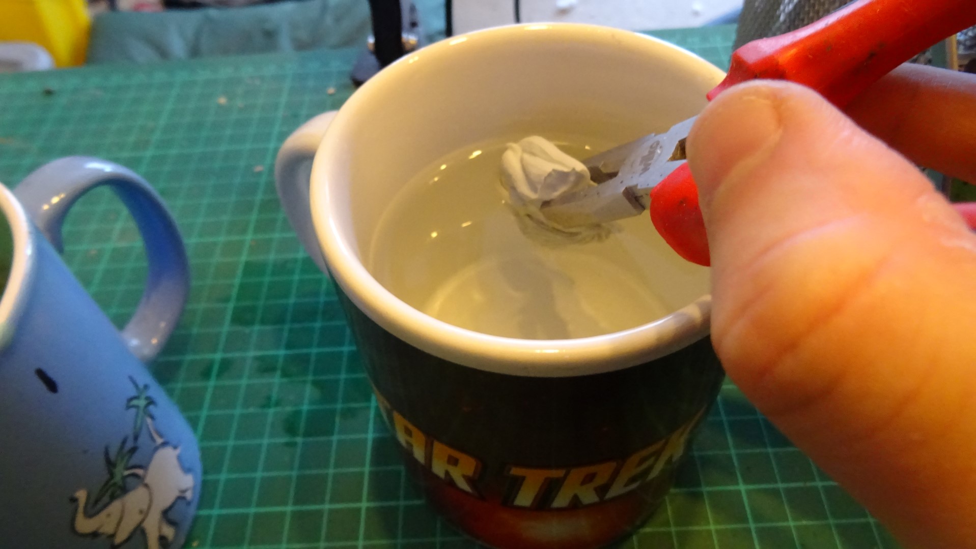 The biggest repose is in the right hand leg. Repose that and you’re 90% there! I used hot water to bend the resin. I had two mugs on my desk, one of hot water (just boiled) for softening the resin and one of cold water for setting it. I used pliers to hold the relevant pieces in the water for around 30 seconds to a minute to get them ready for bending.
