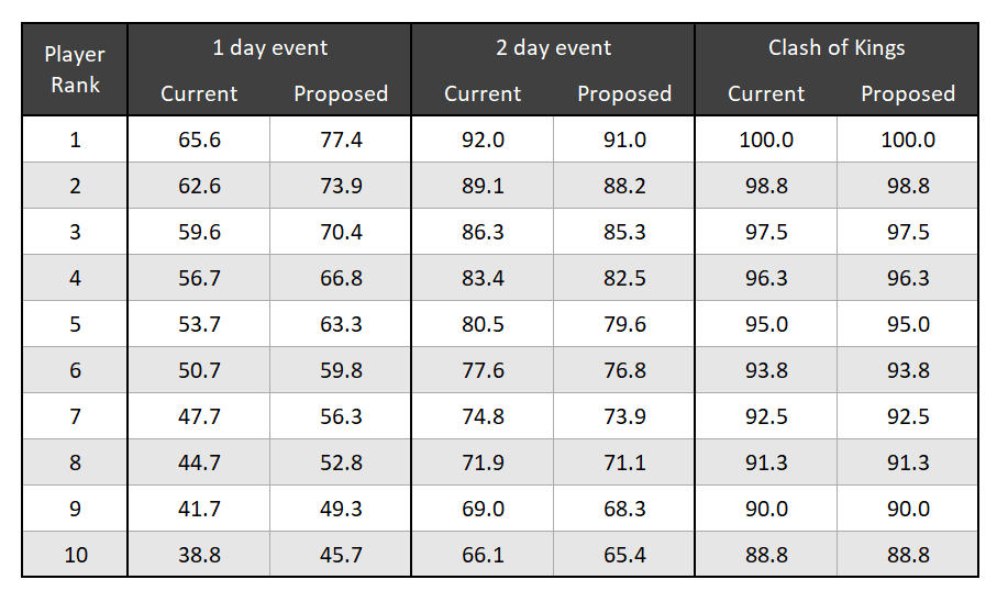 The gap has now closed significantly between medium and large (for KoW) events. 20 player events now have a maximum score of 85, while 30 player events have a maximum score of 90. I bumped the cap up partly so we could keep the 100 points as a maximum, but also to make a further split between Clash of Kings (the only UK event with over 50 players) and other two day events.