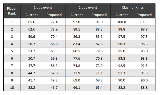 The biggest and most immediate difference is that the score for a one day event jumps up significantly. Whereas before, winning that event would net you 65.6 points, now you would earn 77.4. This closes the gap between a one day and two day event. Winning the two day event still gives you a significant increase over the one day event (+18% more points) so the two day events still offer large rewards ranking wise.