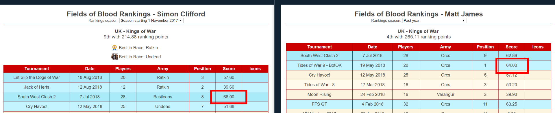 Simon Clifford came 8th at South West Clash 2, which was a 2 day event with 28 players. Matt James came first at Tides of War 9, a one day event with 20 players. Simon got more ranking points.