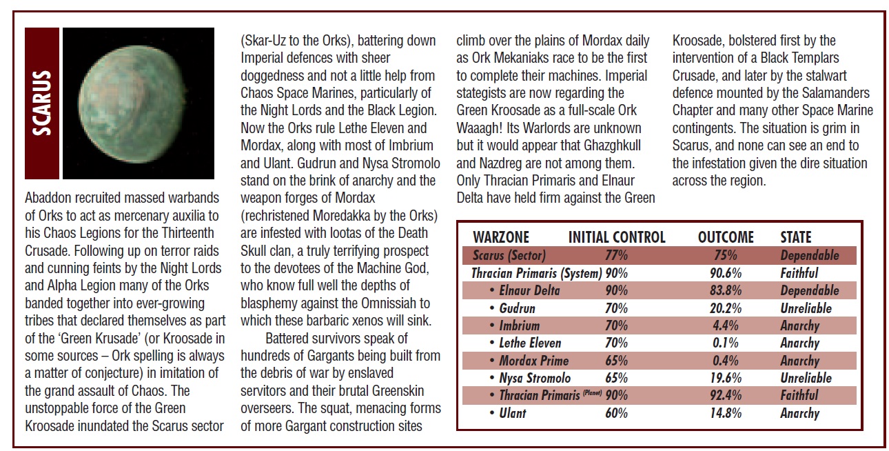 Players soon settled on the Scarus sector (soon to be referred to as Skar-Uz). It was remote and relatively unimportant so wouldn’t get much attention from other players. Orks stood a better chance of making a difference there than anywhere else.