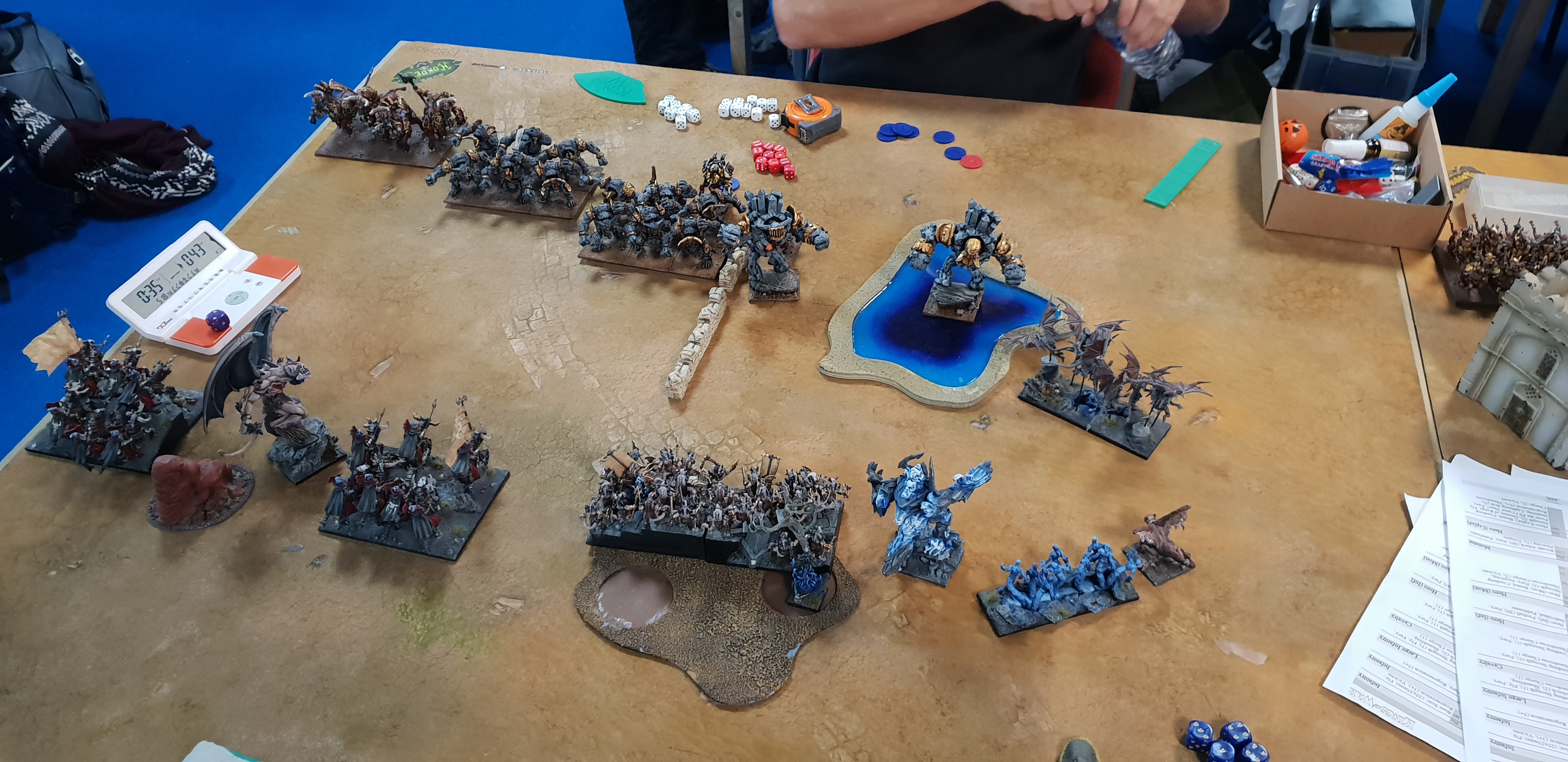 We were playing Push with two loot counters each and immediately the biggest weakness of my list became apparent. I simply did not have enough units to spread out across the board and I couldn’t cover everywhere at once. I could only offer a couple of speedbumps on either flank (the Abyssal Horsemen) to try and delay him if he tried to push his Loot counter down one, while the rest of my forces took up position nearer the centre.
